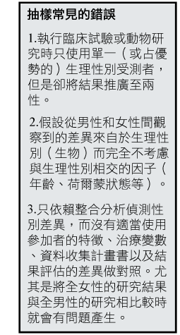 - 與生理性別和社會性別交織的因子:年齡、身體組成以及共病率等變數通常可能和生理性別相關(或是一同變異),如果沒有將這些因子納入考慮,可能會混淆結果。舉例來說,由於心血管(CV)事件在男性身上診斷到的年齡比女性低,而許多心血管試驗又有年齡臨界值,因而多數心血管試驗中,符合資格的女性比例較低。此外,參加心血管試驗的女性,例如,與降低膽固醇藥物相關的實驗,其年齡普遍較高而且相較於男性,有較多(與年齡相關)的共病(Dey et al., 2009)。僅比較只有男性或是只有女性之心血管試驗的結果而不考慮年齡因素,可能導致對試驗發現的錯誤詮釋。